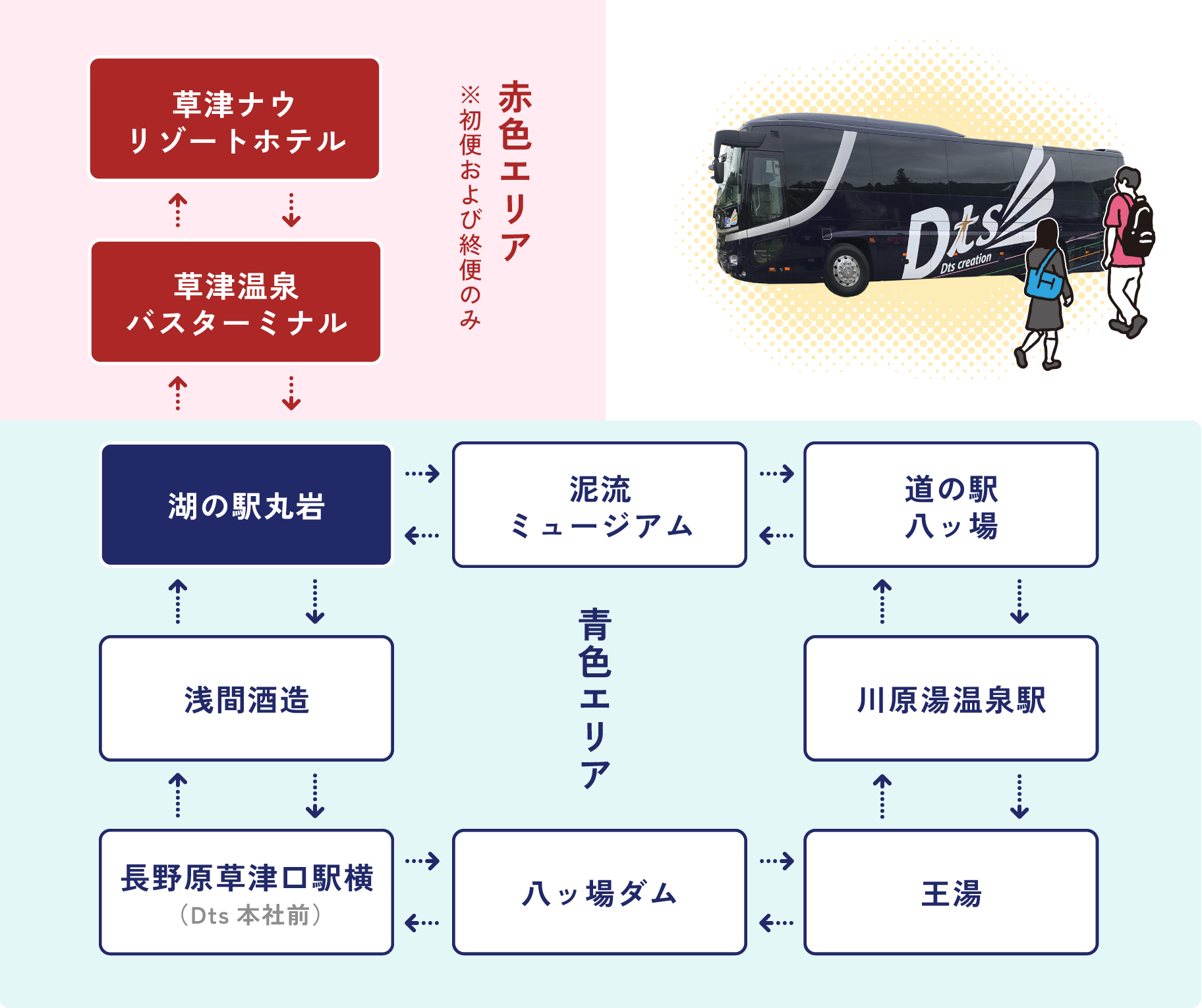 乗車券は当日、湖の駅丸岩、長野原草津口駅横Dts creation 本社でもご購入いただけます。 (車内でも購入可能ですが、その際は釣り銭のないようご用意をお願い申し上げます。)